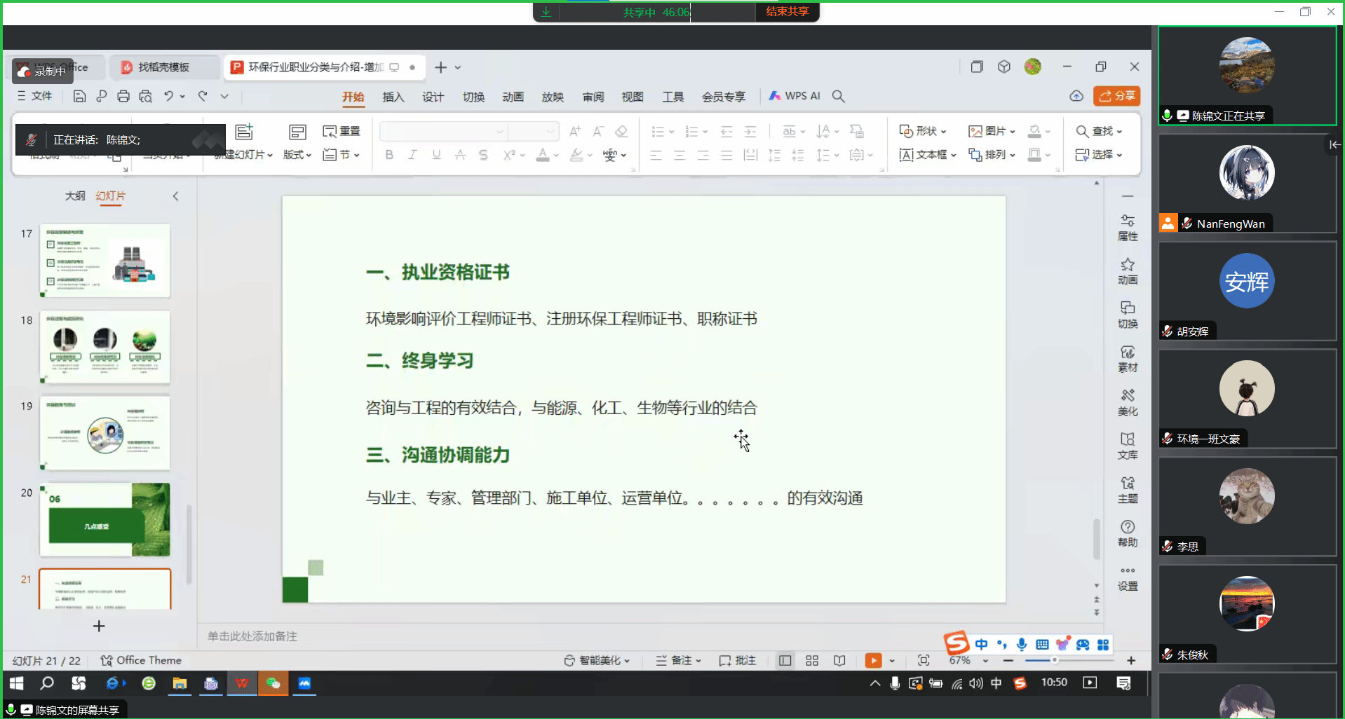 第二位分享的是陈锦文。陈锦文2004年就读于环境专业的硕士,现任四川锦美环保股份有限公司环境咨询中心负责人。陈锦文学长从亲身经历出发,分享了个人在择业、国企、私企三个人生阶段进行奋斗的成长经历,结合自己的经历,激励同学们一步步从基层扎实打拼,勤奋学习,并最终成长为行业领军人物。他还建议同学们在校期间做好就业的准备工作,针对性地培养从业所必须的能力和相关证书。