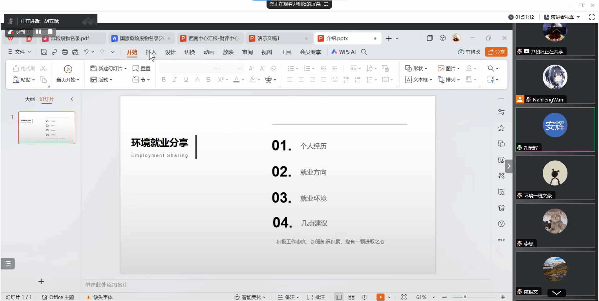 第三位分享的是尹朝阳。尹朝阳2008年就读于伟德1949官网,现就职于四川省生态环境科学研究院,任固体所副所长。尹朝阳学长从环境学科就业方向的角度出发,为同学们分析了各个职业选择的优势,帮助同学们梳理不同职业的工作内容和所需要的条件,分享他在就业时的经验和想法。他特别强调了同学们要发挥学习的主观能动性,培养终身学习的观念,主动积极学习行业最新的政策和方法,紧跟国家发展步伐,以此来提高职场竞争力。