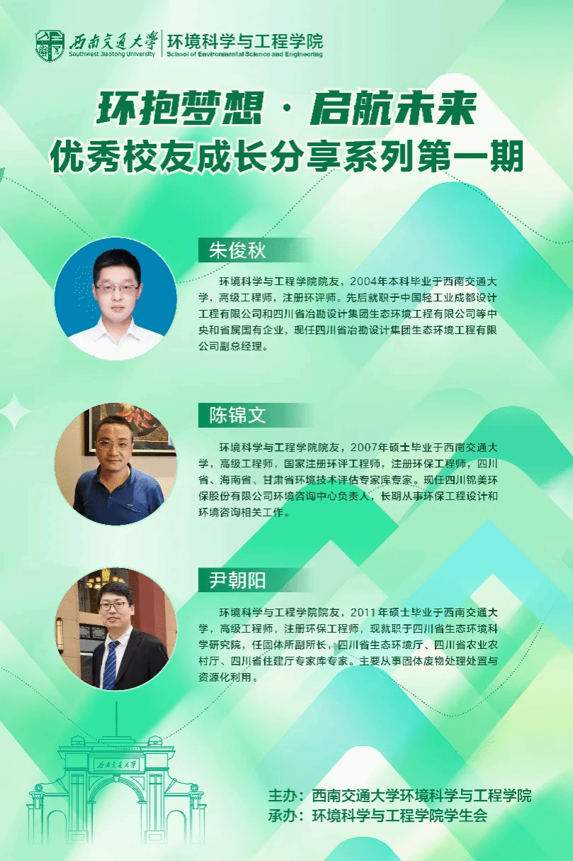 第二位分享的是陈锦文。陈锦文2004年就读于环境专业的硕士,现任四川锦美环保股份有限公司环境咨询中心负责人。陈锦文学长从亲身经历出发,分享了个人在择业、国企、私企三个人生阶段进行奋斗的成长经历,结合自己的经历,激励同学们一步步从基层扎实打拼,勤奋学习,并最终成长为行业领军人物。他还建议同学们在校期间做好就业的准备工作,针对性地培养从业所必须的能力和相关证书。