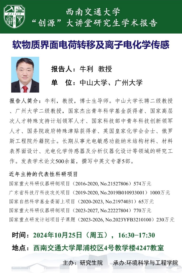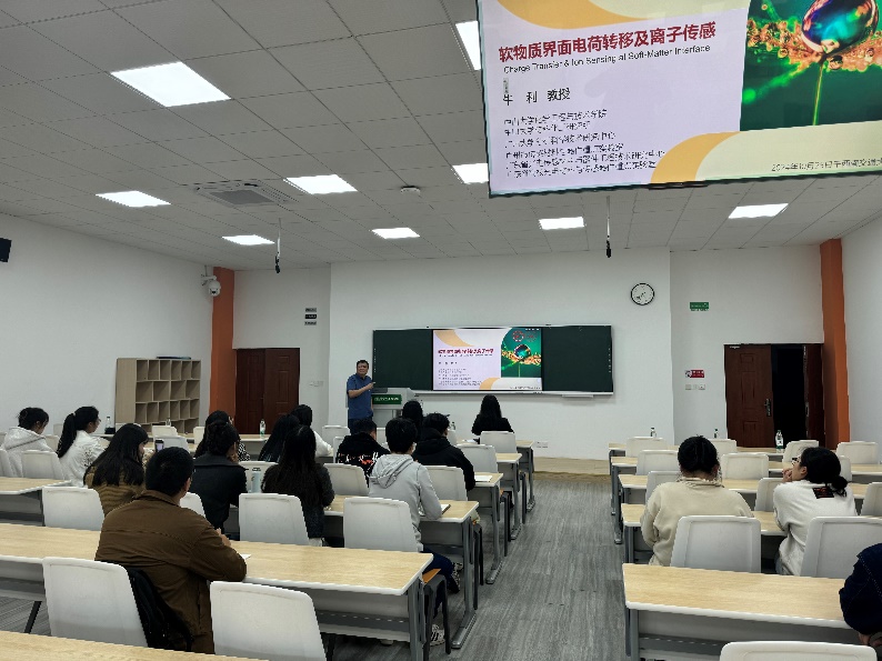 2024年10月25日,中山大学长聘二级教授、广州大学二级教授,国家杰出青年科学基金获得者、英国皇家化学会会士、俄罗斯工程院外籍院士牛利教授应邀来访伟德1949官网,在犀浦校区X4247作题为“软物质界面电荷转移及离子电化学传感”的学术报告。