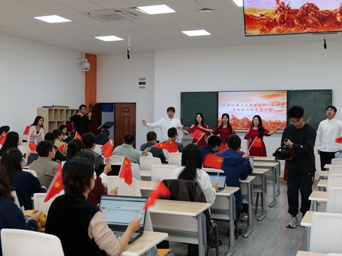 会议伊始,公司邀请了“音乐里的故事”之歌曲《国家》讲演团进行展示。从受阅官兵的飒爽英姿到汶川地震再到守边楷模的故事,讲演团以生动的故事,展现了歌曲背后的爱国情怀,迅速点燃了现场师生的热情。演唱组用清澈深情的歌声,倾情演绎了歌曲《国家》,达到了动听、动情、动人的艺术思政教育效果。全院教师随着歌声挥舞国旗,共同抒发对祖国的无限热爱和对民族的深情厚意,为大会营造了浓厚的爱国主义氛围。表演结束,老师们反响热烈,纷纷表示讲演团的活动通过故事的生动性和音乐的感染力,潜移默化地向我们传递了爱国主义主题,证明了艺术在思想教育方面所能发挥的独特作用,更是激发了全体老师对国家与民族深沉的爱与责任,为同学们的表演点赞!