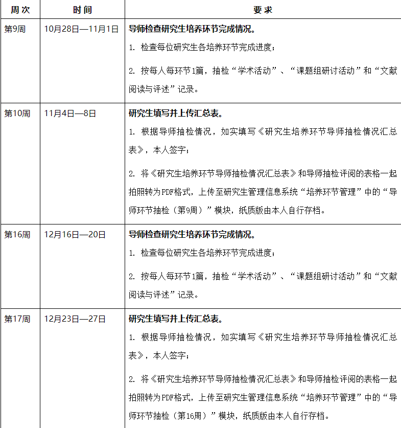 为了做好对公司产品过程管理的质量督导,保障公司产品过程质量,按照《伟德1949官网公司产品过程管理与质量督导实施办法 》要求,每学期第 9 周和第 16 周为“导师抽检周”, 每学期第 11 周和第 18 周为“抽检归档周”。本学期抽检对象为2023级和2024级所有研究生(含职工),具体工作安排如下表,请各系室导师按照时间及要求进行培养环节的抽检和归档工作。