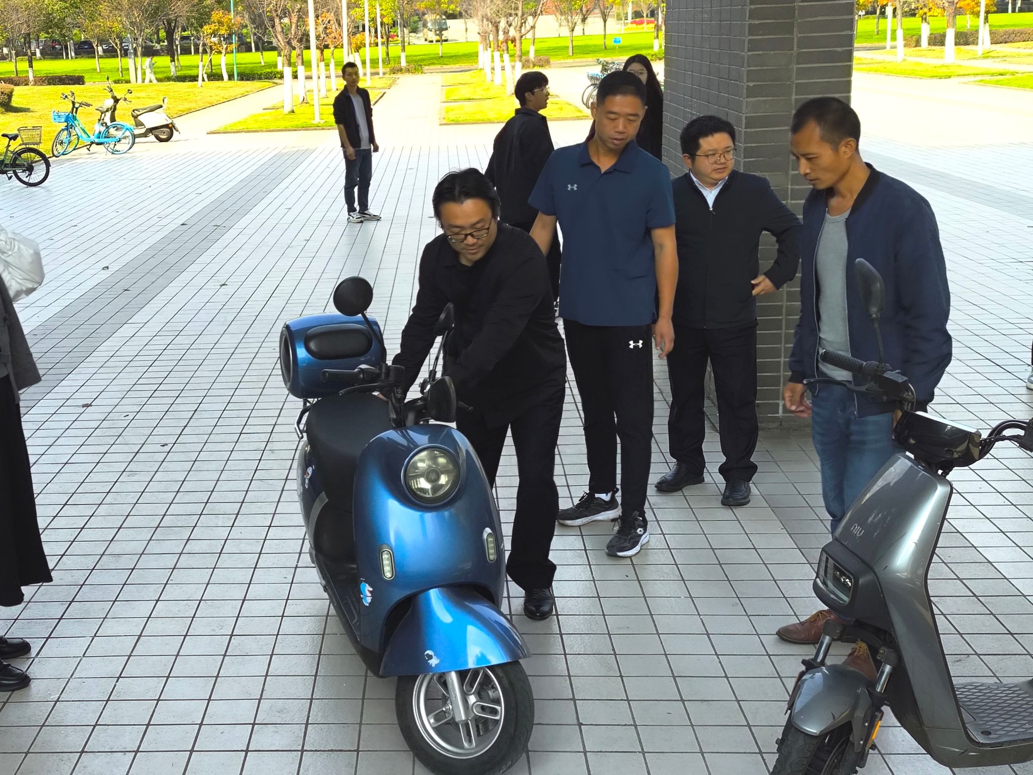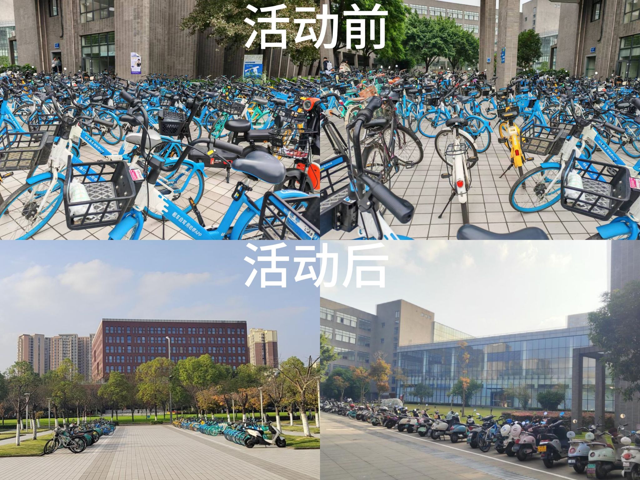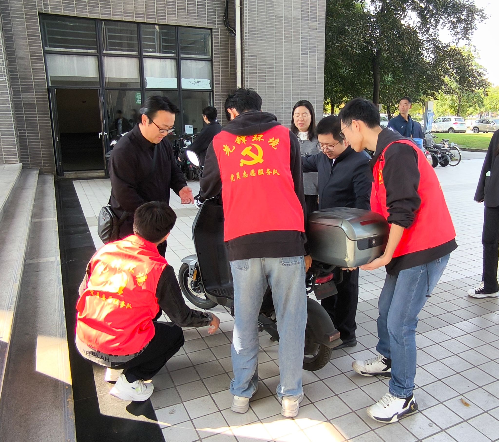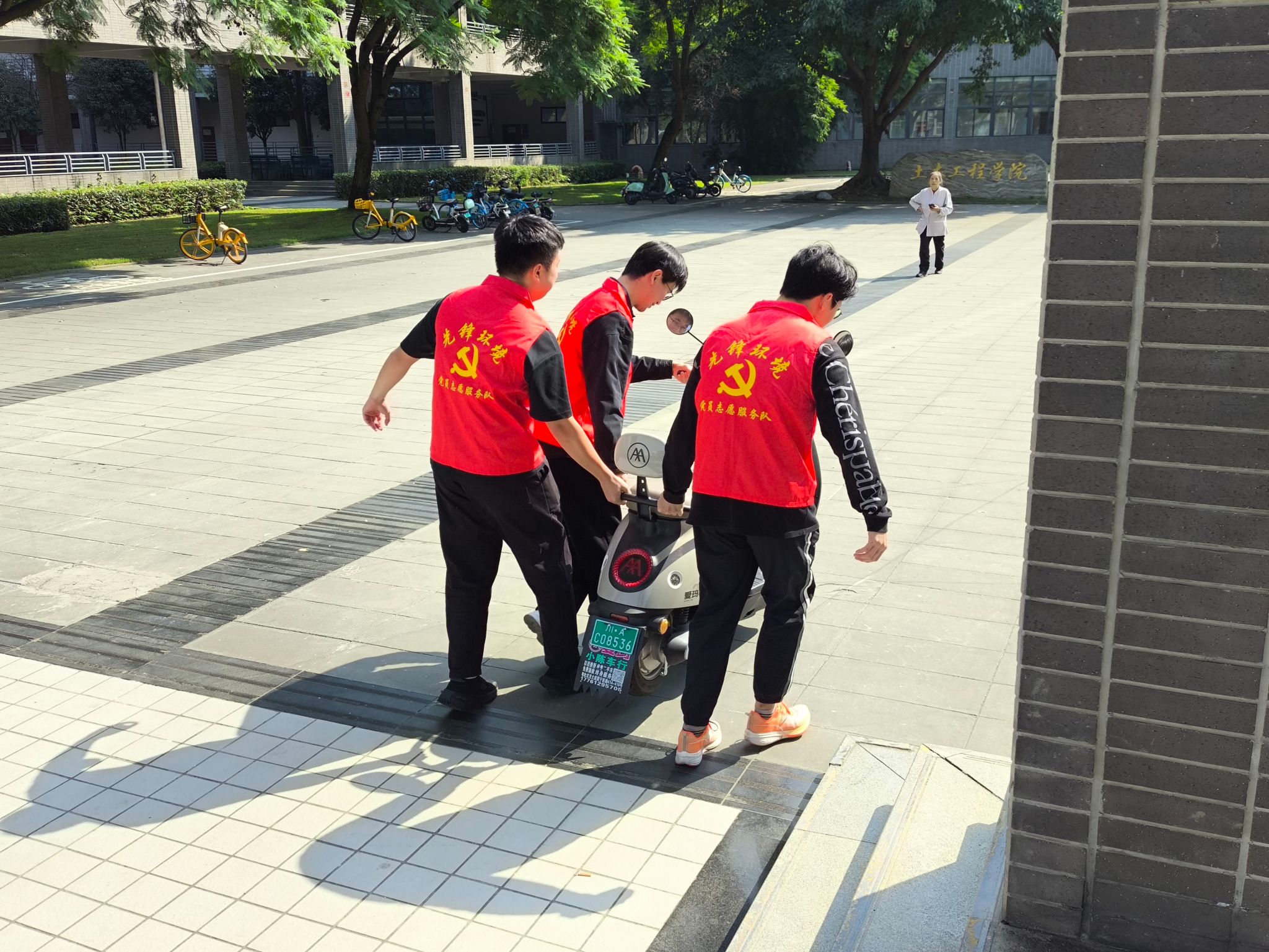 在公司党委书记甘霖,学校保卫处副处长李骐,公司党委副书记胡安辉、团委书记翟琦及各辅导员老师的带领下,员工党员志愿者们认真负责,分工明确,引导同学们将单车和电动车分区停放便于管理,将不规范停放的单车挪到指定区域,并用胶带划出新的单车停放区域。在党员志愿者和公司领导老师的引导下,前来上课的师生积极响应,四号教学楼下的单车停放区域变得十分宽敞整洁。
