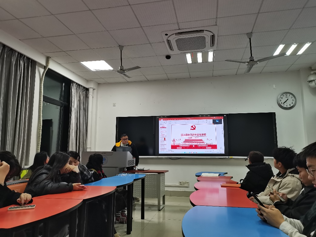 接下来,支部书记唐若愚分享有关《深入领会习近平文化思想》的内容。他从“中央政治局第十七次集体学习讲话精神”、“在文艺工作座谈会上的讲话”、“发扬社会主义文化”这三个方面进行介绍。他介绍了文化建设的重要性,分别以多个点详细展开分享了以上三个方面的内容。并且他呼吁大家要学习文艺工作者“雕琢”精神,汲取力量,将此精神应用于科研,此外,他结合自身体会阐述发扬社会主义文化应辩证扬弃,还要做传承者,这也可以拓宽视野、增长见识。