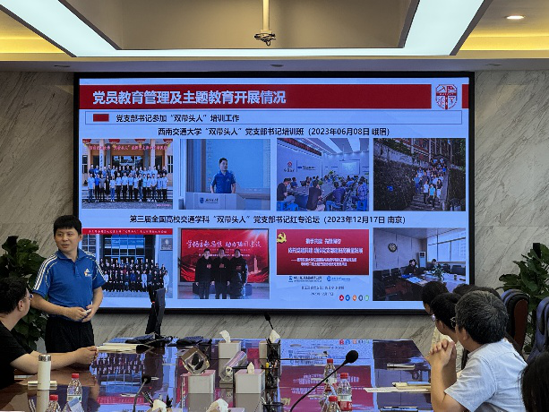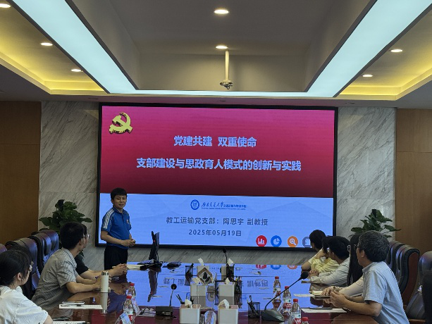 紧接着,交运公司陶思宇副教授围绕支部建设情况展开交流。他介绍了交运公司“两横三纵一合力”的育人体系模式,强调师生合作在支部建设中的重要性,分享了如何充分发挥支部战斗堡垒作用和党员的先锋模范作用,为支部建设提供了宝贵经验。