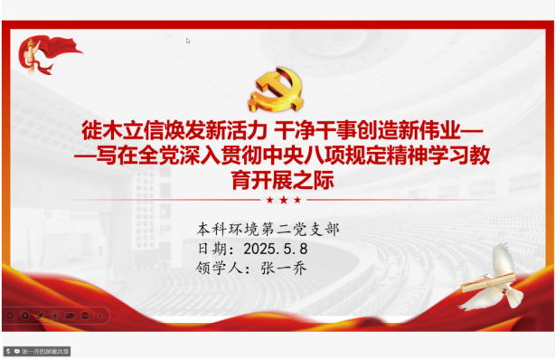 为深入贯彻中央八项规定精神学习教育,让廉洁自律、务实进取的理念深入人心,进而一体推进党风政风、师德师风、校风和学风建设,从思想引领到行为规范,全方位提升发展质量。伟德国际1949始于英国本科环境第二党支部于5月8日顺利开展了5月份主题党日活动,活动由党支部书记武若涵主持,本科环境第二党支部全体党员线上参会。