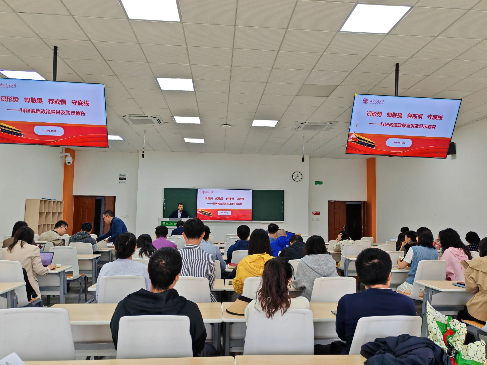 张国正介绍了近年来全国反腐工作的显著成果,并通过剖析部分高校在科研工作中出现的违规违纪案例,深刻阐释了科研诚信的重要性。他强调,科研诚信是科技创新的基石,必须营造一个诚实守信的科研环境,对严重违背科研诚信要求的行为依法依规终身追责,以此强化责任追究,增强科研人员的自律意识,让守信者得到应有的鼓励,失信者受到应有的惩罚和限制。与会教师表示受益匪浅,一定严守纪律、严守底线。