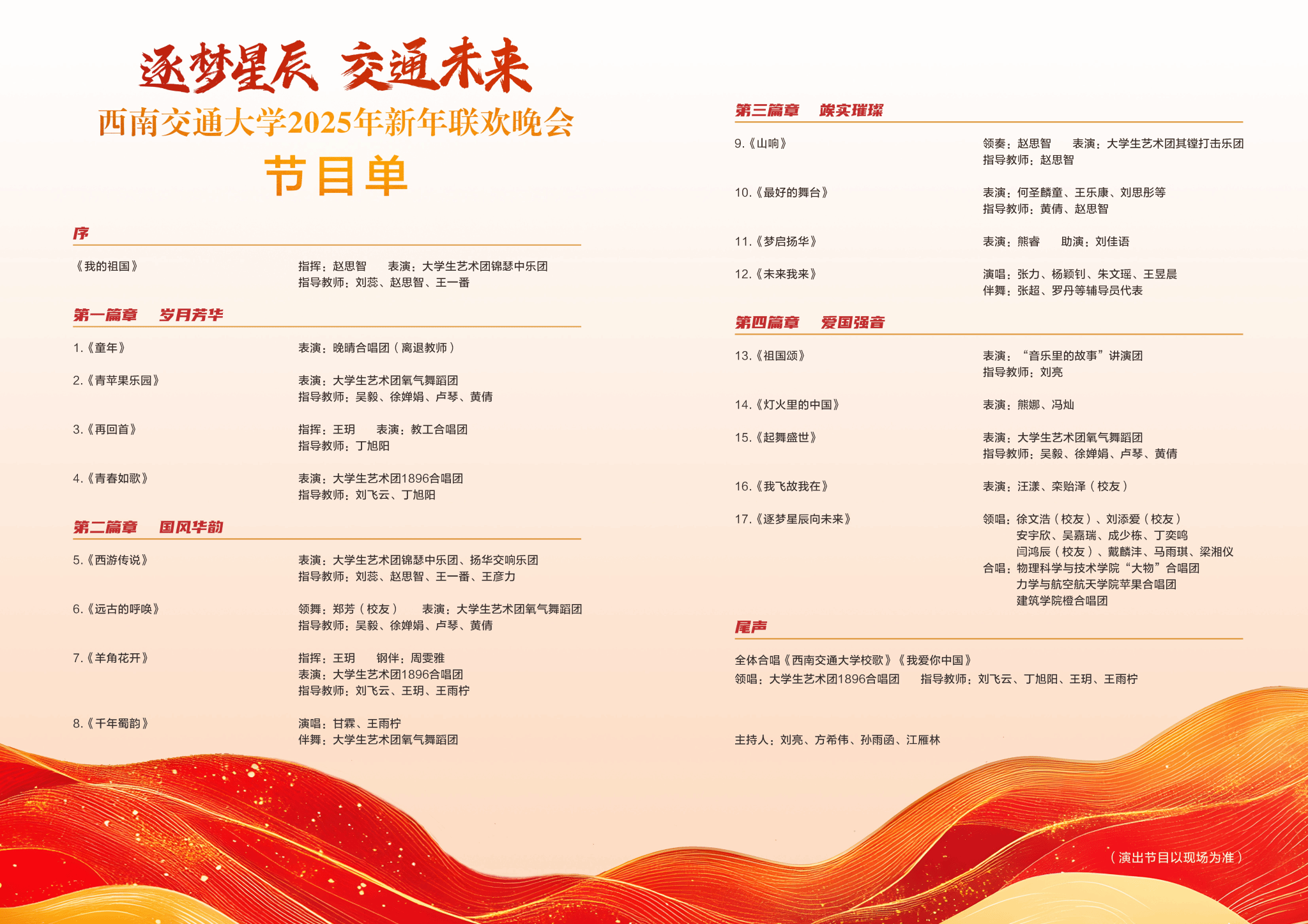 一元复始山河美,万象更新锦绣春。2024年即将结束,在这辞旧迎新之际,为营造欢乐、祥和的校园文化氛围,学校将举办“逐梦星辰 交通未来”伟德1949官网2025年新年联欢晚会。诚邀全校师生员工员工观看,共同辞别旧岁,喜迎新年!